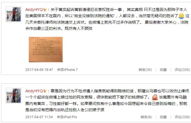 據悉,黃毅清4月7日在微博發文,把黃奕比作馬蓉,指責對方不檢點。自黃奕斥前夫黃毅清名譽侵權一審勝訴后,黃毅清更是連發幾條微博表達不滿,更要求“二審見”,還放話:“沒有我打不贏的官司。 ”