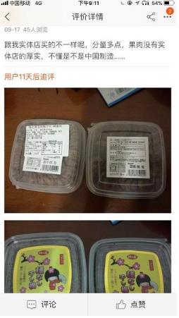 記者看到,這家店肆雖是皇冠賣家,但在買家中口碑卻并不好。不少買家公開在談論區里責備其疑似售假。其間,就有一位網友留言稱:“跟我實體店買的不一樣,果肉沒有那么扎實……”